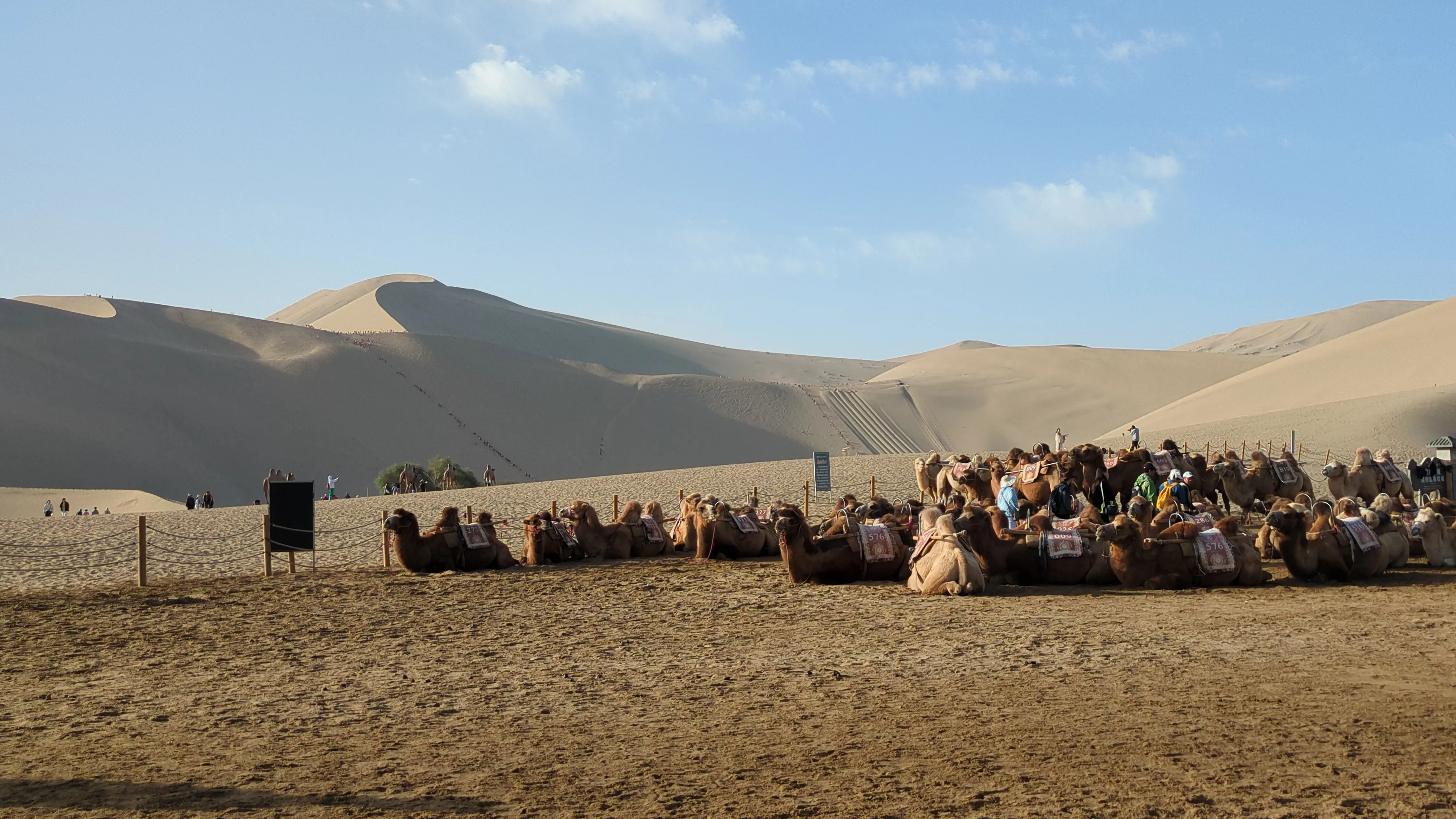 入り口を入り、奥へ進んでいくと鳴沙山の砂山とラクダさんが見えてきます。
