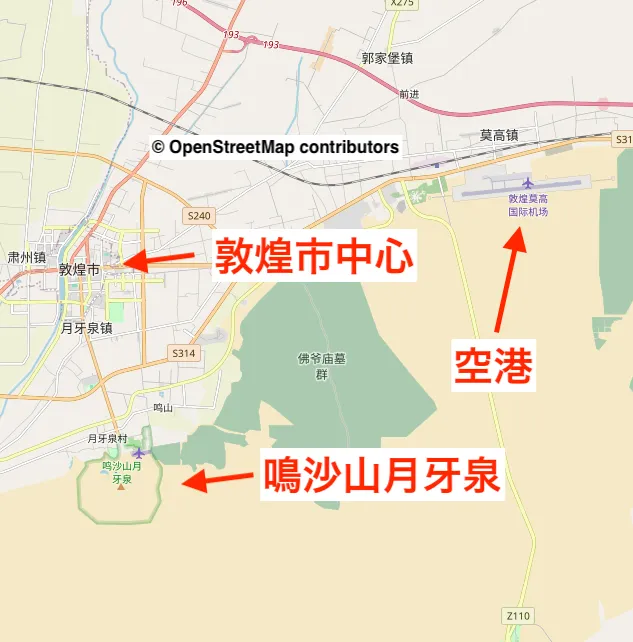 敦煌市内での鳴沙山月牙泉の位置はこんな感じ。