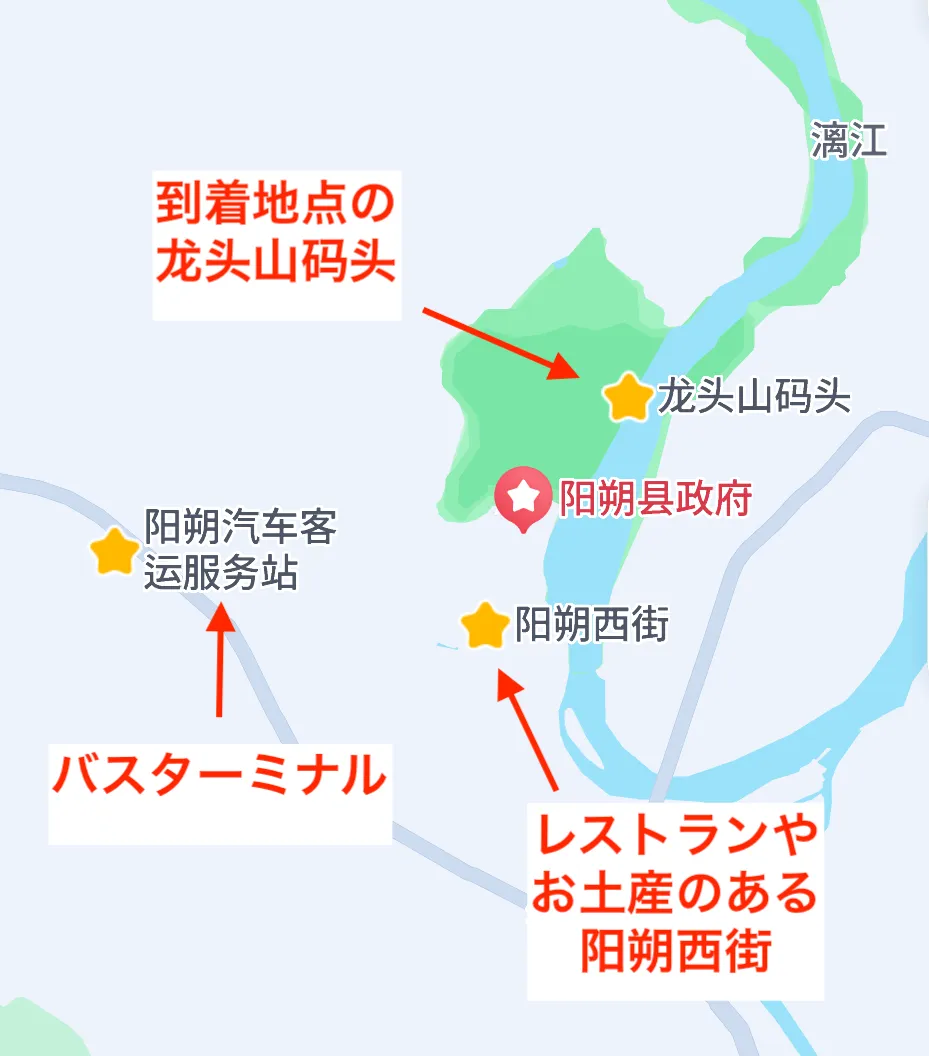 今回ボクは磨盘山客运港から下り始めて、龙头山码头(陽朔)まで行きました。