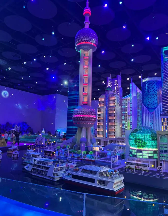 個人的に一番印象に残ったのは、室内展示場にあった「上海タワー」のミニサイズ。ライトアップされた姿は本物さながらで、幻想的な雰囲気に思わず足を止めてしまいました。細部までレゴで再現されていて、技術と遊び心の融合に感動。