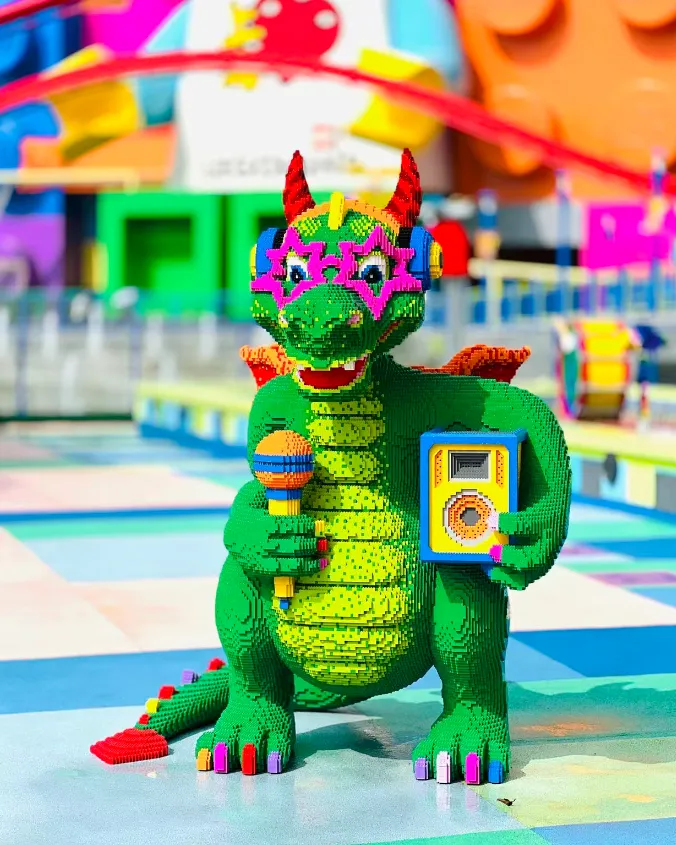 入場ゲートを抜けると、すぐ目の前に現れるのは巨大なフォトスポット。レゴブロックで作られたカラフルなオブジェが並び、まるで自分がレゴの世界に入り込んだような感覚に。子ども連れの家族が多く、みんな笑顔で写真を撮っていて、ほっこりした雰囲気が漂っていました。