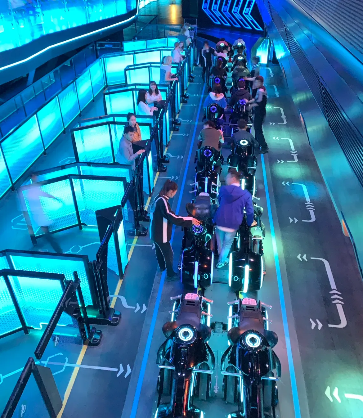 バイク型コースターにまたがり、未来都市を駆け抜ける爽快な体験。建物の外にも飛び出す構造で、スピード感と臨場感が抜群でした。世界でここでしか体験できないアトラクションは、ぜひおすすめです。